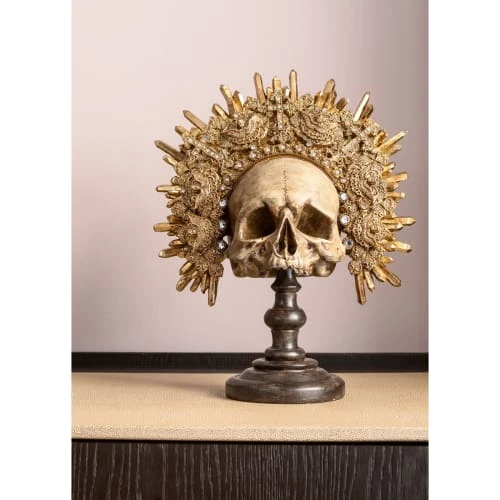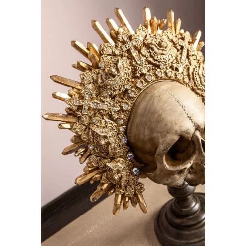 Cette déco crâne avec une couronne luxueuse vous fera voyager dans l’Amérique latine du temps des cités d’or ! Tel un véritable trésor d’Indiana Jones, sa couronne dorée élaborée avec des croix, des fleurs et des cristaux apporte une touche féminine et chic qui vient contraster avec le crâne effrayant rappelant une relique. Une pièce tendance et insolite parfaite pour créer un mini musée inédit dans votre salon ou entrée.